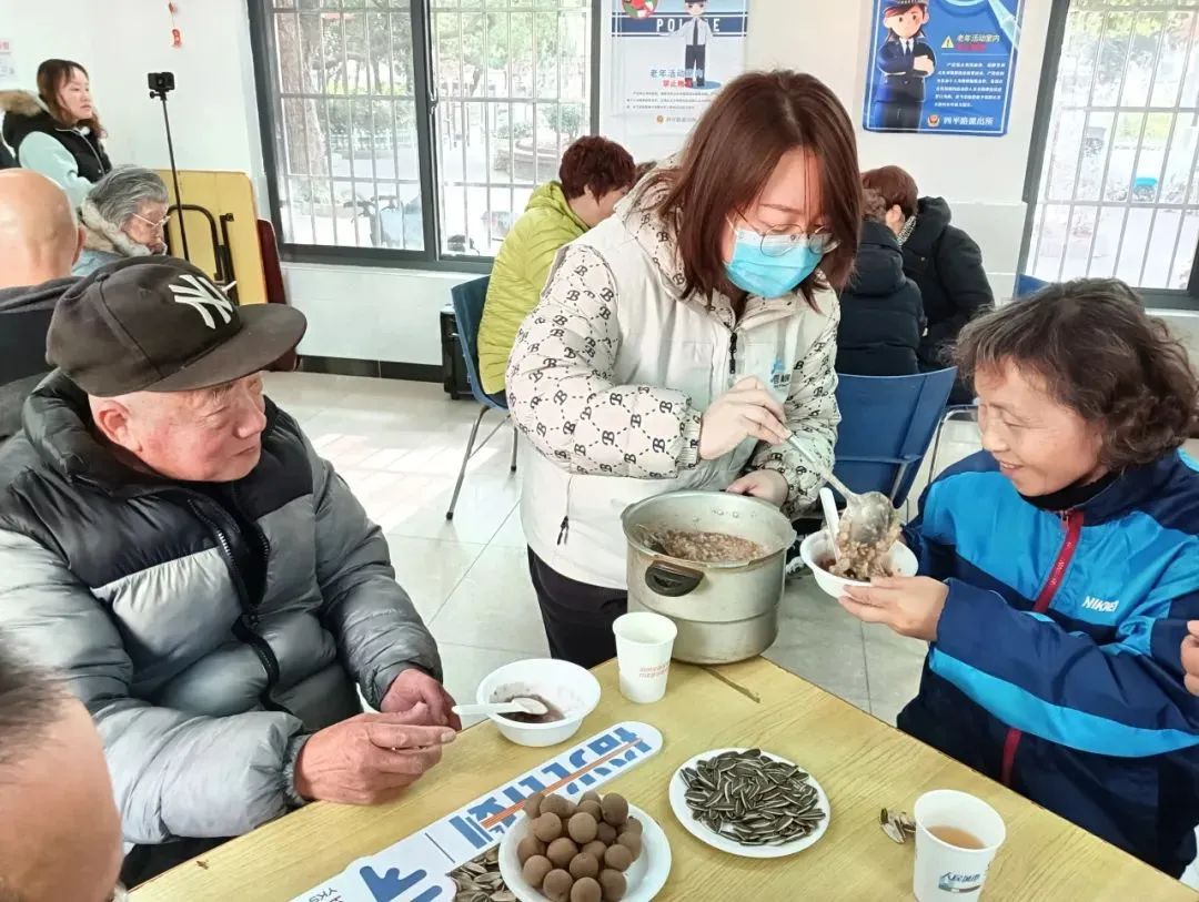 1月7日,四平社区公益基金会举办腊八节活动。社区长者享用到由志愿者亲手制作的腊八粥,并参与了缅怀腊八红色历史和制作非遗门幅的活动。活动结束时,爱心居民及党员志愿者还将腊八粥和手工袜套等物资送至长者日间照护中心,分享给那里的老人们。