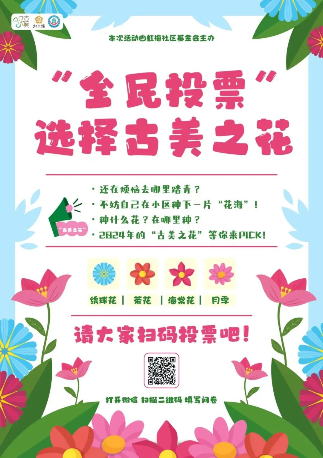 近日,由虹梅社区基金会主办的“全民投票-选择古美之花”活动迎春开启,经过前期的意见征询会,居民代表精选了茶花、月季、绣球、和海棠四种花卉,成为本次投票活动的“候选之花”。根据投票数,各居委将获得不同数量的盆栽和改造基金,用于后续种植。